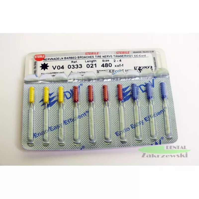 Miazgociągi VDW to ręczne narzędzia kanałowe przeznaczone do usuwania miazgi z kanału korzeniowego. Zbudowane z około 40 spiralnie wystających elastycznych ząbków na stożkowatym rdzeniu, których wielkość odpowiada połowie średnicy rdzenia. Kodowane kolorystycznie uchwyty CC-Cord (zgodnie ze standardem ISO) ułatwiają szybką identyfikację rozmiaru narzędzia. Wyprodukowane ze stali nierdzewnej o długości 21 mm. Produkt sterylny.