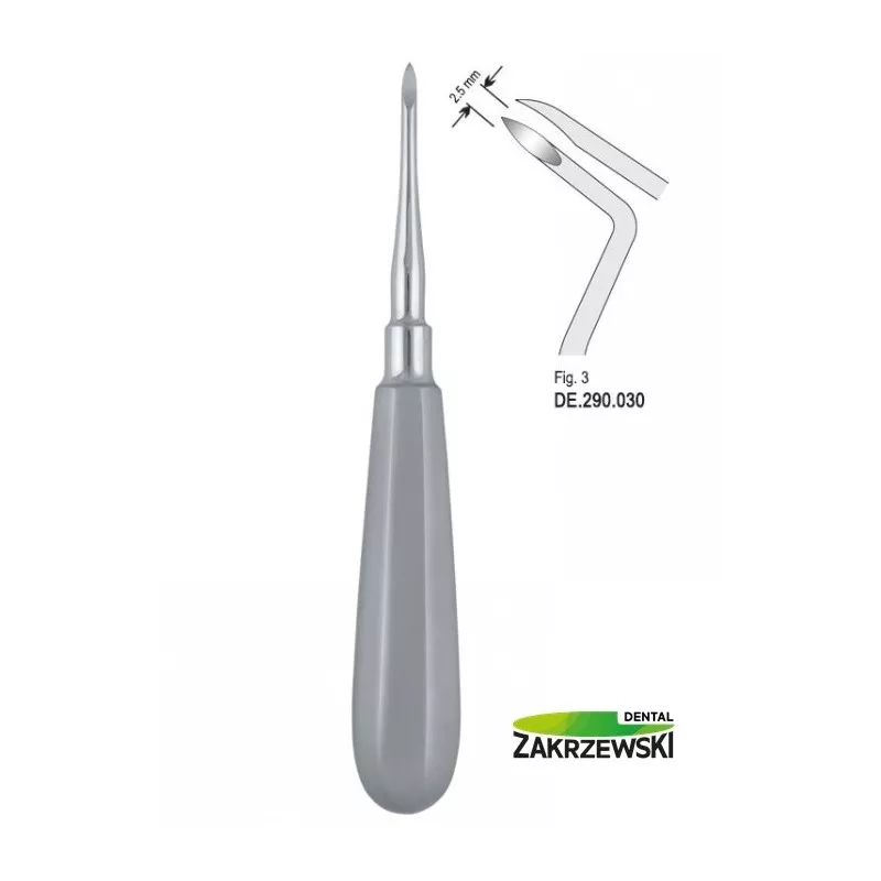 Dźwignia korzeniowa Heidebrink przeznaczona do usuwania korzeni lub części korzeni, czyli tzw. apeksów (wierzchołków) pozostałych w kości po usuniętym zębie.