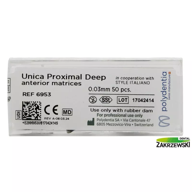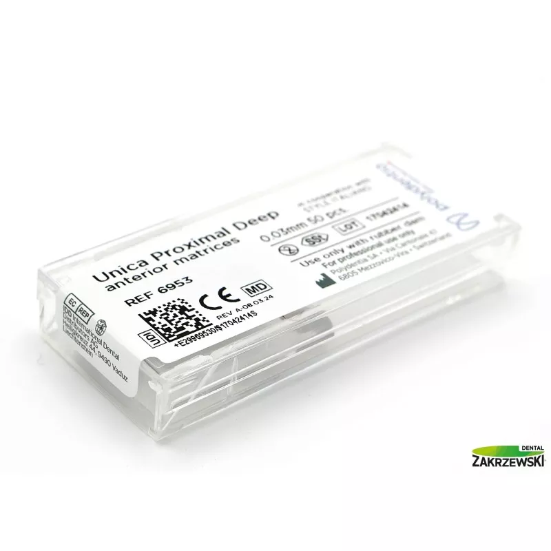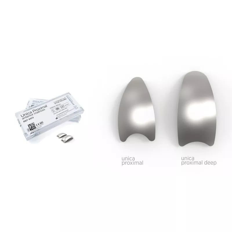 Matryce ze stali nierdzewnej Unica Proximal firmy Polydentia mają grubość 0,03 mm i są dostępne w dwóch kształtach standardowym i głębokim, zaprojektowanych tak, aby pasowały do konturu zębów przednich na powierzchniach: wargowych, podniebiennych i proksymalnych.