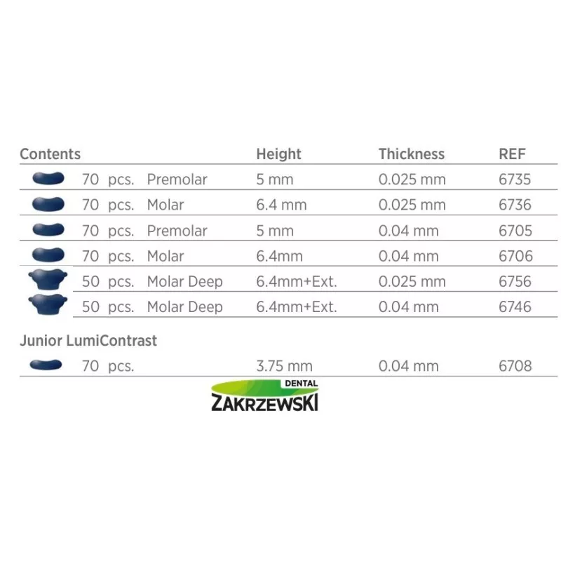 Quickmat LumiContrast to niebieskie matryce częściowe przeznaczone do odbudowy zębów przedtrzonowych i trzonowych o grubości 0,04mm i wysokości 5 lub 6,4mm.