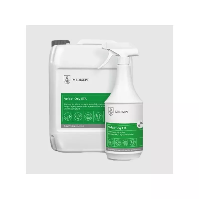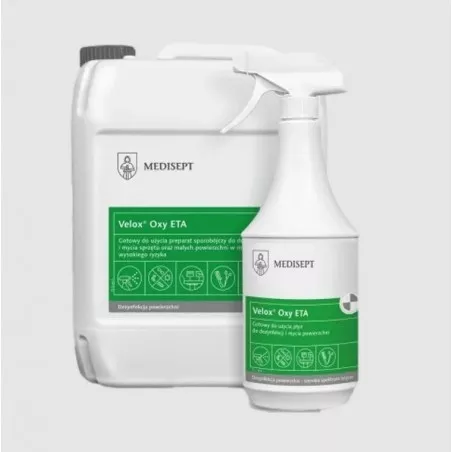 Velox® Oxy ETA rekomendowany jest do dezynfekcji małych powierzchni sprzętu medycznego, w tym łóżek i foteli zabiegowych, szafek pacjenta, aparatury medycznej i operacyjnej, inkubatorów, sprzętu rehabilitacyjnego, a także końcówek stomatologicznych, unitów, lamp zabiegowych, blatów roboczych, łyżek protetycznych, protez i wycisków. Velox® Oxy ETA wykazuje wysoką tolerancję materiałową – może być stosowany do dezynfekcji powierzchni wykonanych z tworzyw sztucznych ABS, materiałów obiciowych, w tym skóry naturalnej, gumy, silikonu oraVelox Oxy ETA 1 l