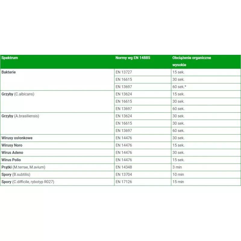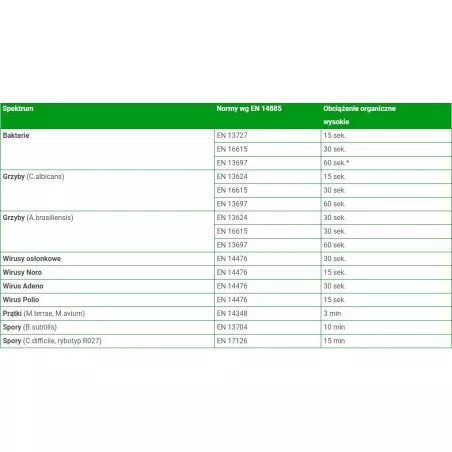 Szerokie działanie sporobójcze w czasie 15 min (C.difficile, B.subtilis)
