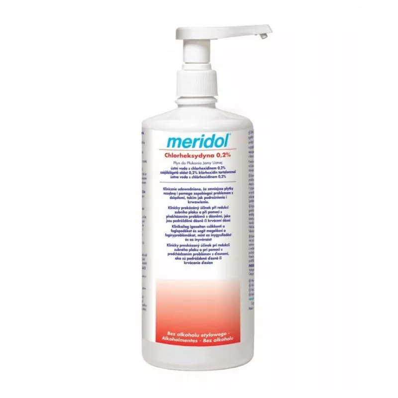 Płyn do płukania jamy ustnej MERIDOL z chlorheksydyną o stężeniu 0,20% działa antybakteryjnie, zapobiega stanom zapalnym dziąseł oraz redukuje i ogranicza występowanie płytki nazębnej. Preparat nie zawiera alkoholu przez co może być bezpiecznie stosowany w leczeniu zapalenia czy krwawienia dziąseł. Meridol jest gotowy do użycia, bez konieczności rozcieńczania
