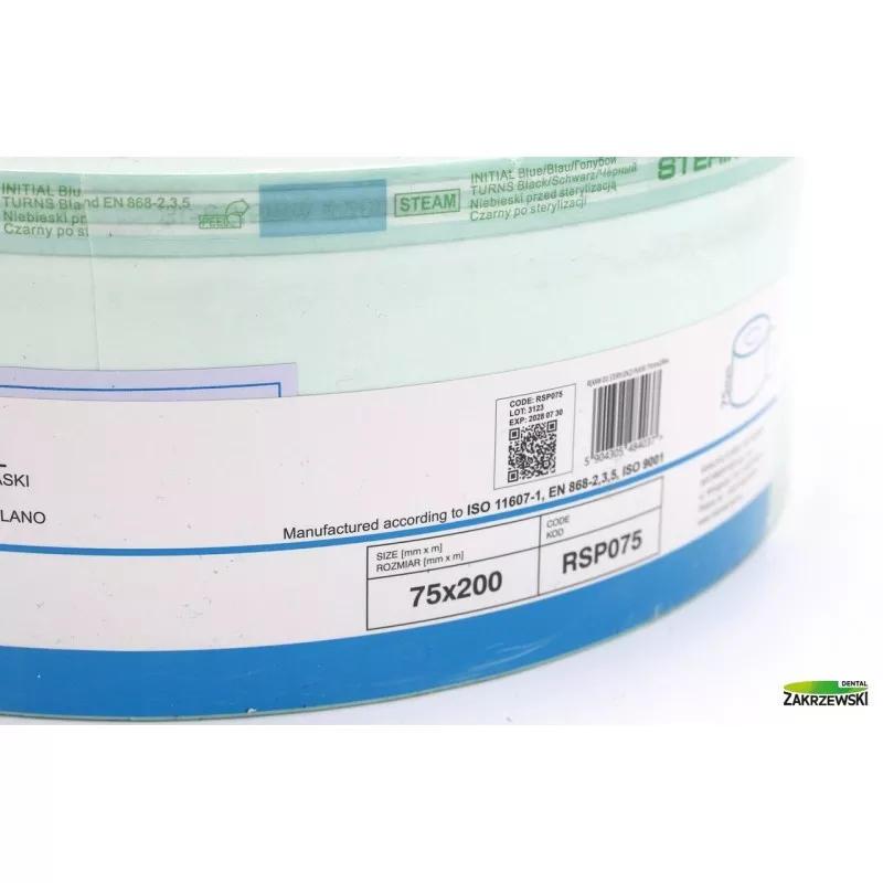 na linii zgrzewu rękawa do sterylizacji umieszczono wskaźniki chemiczne typu 1 sterylizacji STEAM, EO i FORM (wraz z informacją o kolorze wskaźnika przed i po procesie sterylizacji a także podstawowe informacje techniczne - nr LOT, data produkcji, rozmiar. Informacje podane są w czterech językach