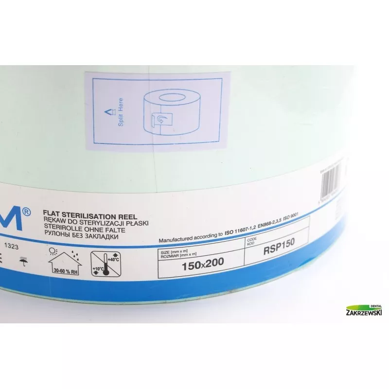 na linii zgrzewu rękawa do sterylizacji umieszczono wskaźniki chemiczne typu 1 sterylizacji STEAM, EO i FORM (wraz z informacją o kolorze wskaźnika przed i po procesie sterylizacji a także podstawowe informacje techniczne - nr LOT, data produkcji, rozmiar. Informacje podane są w czterech językach