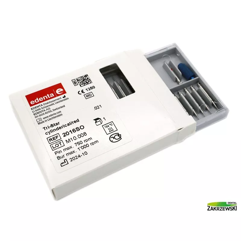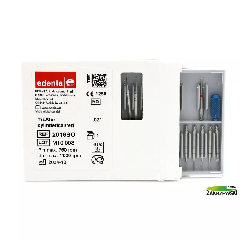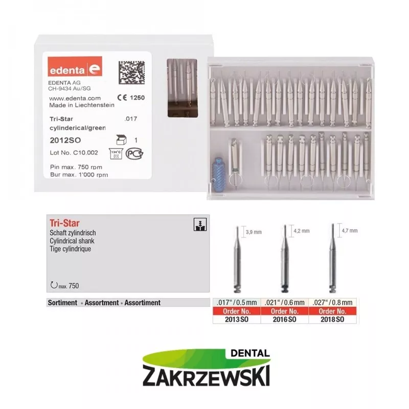 Tytanowe ćwieki okołomiazgowe Edenta Tri-Star są przeznaczone do rekonstrukcji zębów w przypadkach ze znacznym stopniem uszkodzonych tkanek. Umożliwiają one odbudowę części koronowej zęba przy pomocy materiałów wypełnieniowych na podstawie jego pozostałej, naturalnej części. Dryl - wiertło znajdujące się w zestawie umożliwia przygotowanie odpowiedniego miejsca na ćwiek. Sztyfty okołomiazgowe Edenta ułatwiają zamocowanie materiałów kompozytowych co gwarantuje stabilność i trwałość rekonstrukcji zęba.