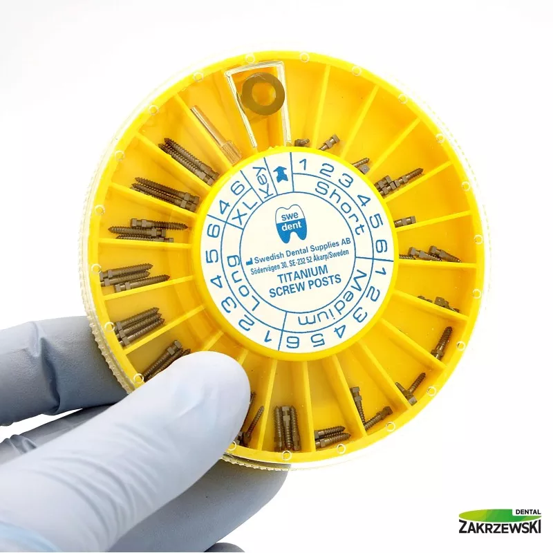 Wkłady koronowo-korzeniowe, tytanowe o cylindrycznym kształcie z wyodrębnioną częścią koronową do odbudowy zębów przednich jak i bocznych.