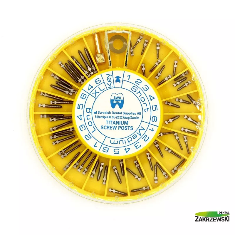 Wkłady tytanowe wyprodukowane dla Swedent przez firmę Nordin. Od wkładów Nordin różnią się częścią koronowa na którą pasuje tylko klucz zewnętrzny – nasadowy ( hollow key). Brak nacięć krzyżakowych w środku główki.